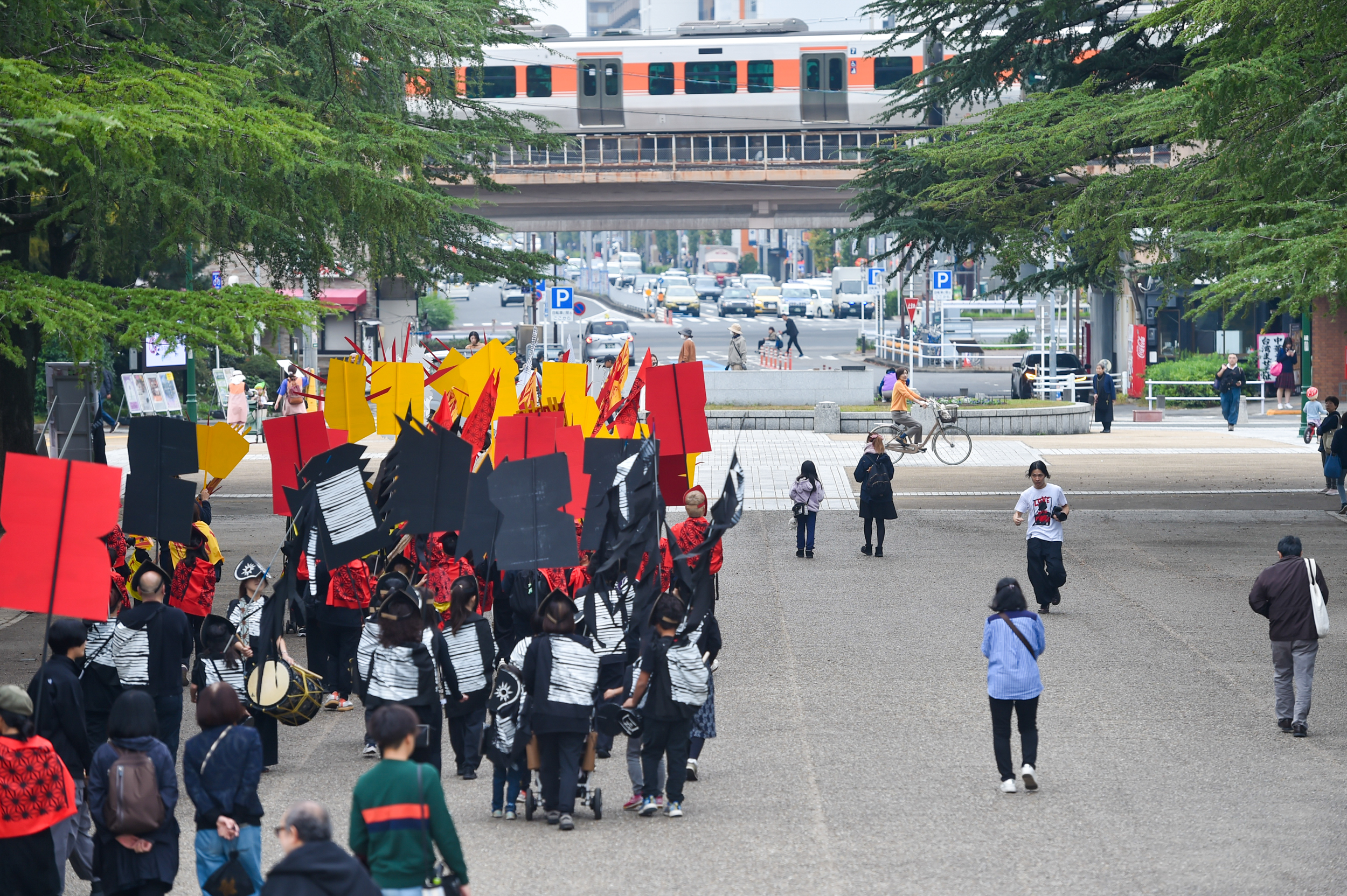 2023年の第一弾パレードでは、かつて鶴舞周辺が池や田んぼで埋め尽くされた土地だったことをテーマに「WHERE WATER FLOWS」と題し、水の動きを感じさせる衣装を鶴舞の住民の人々と作り、公園内を歩きました。